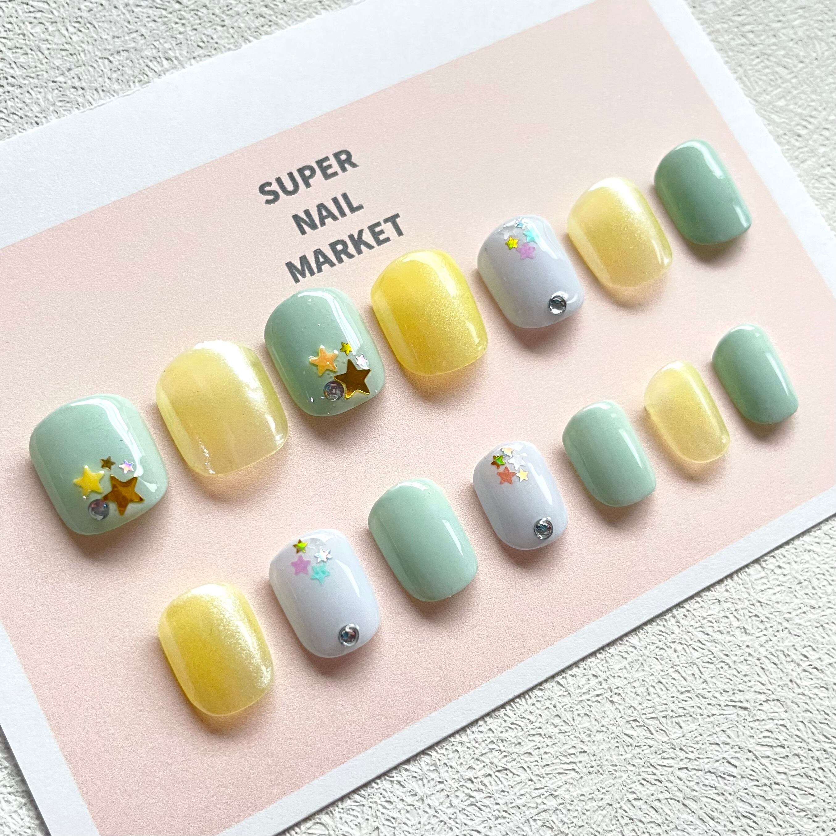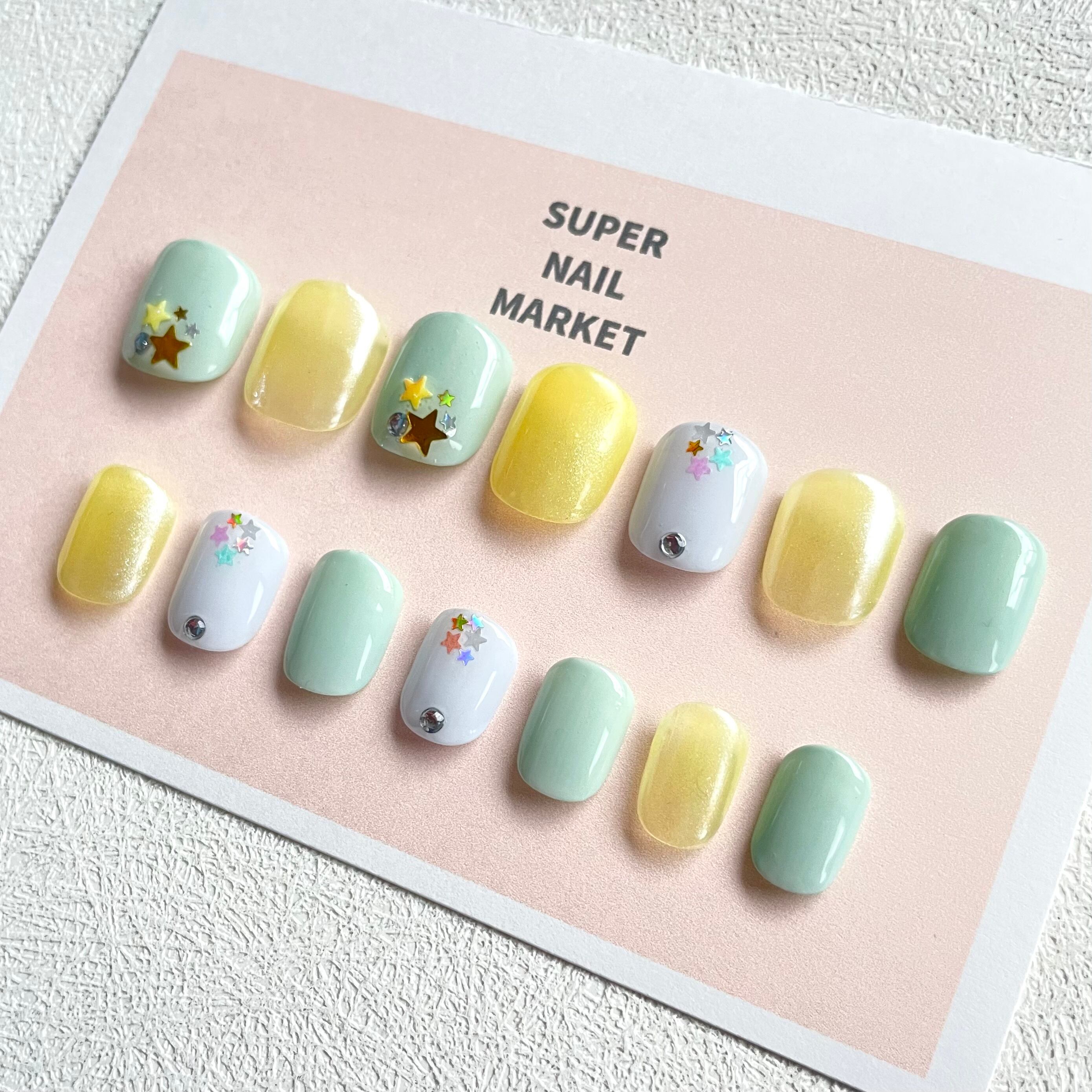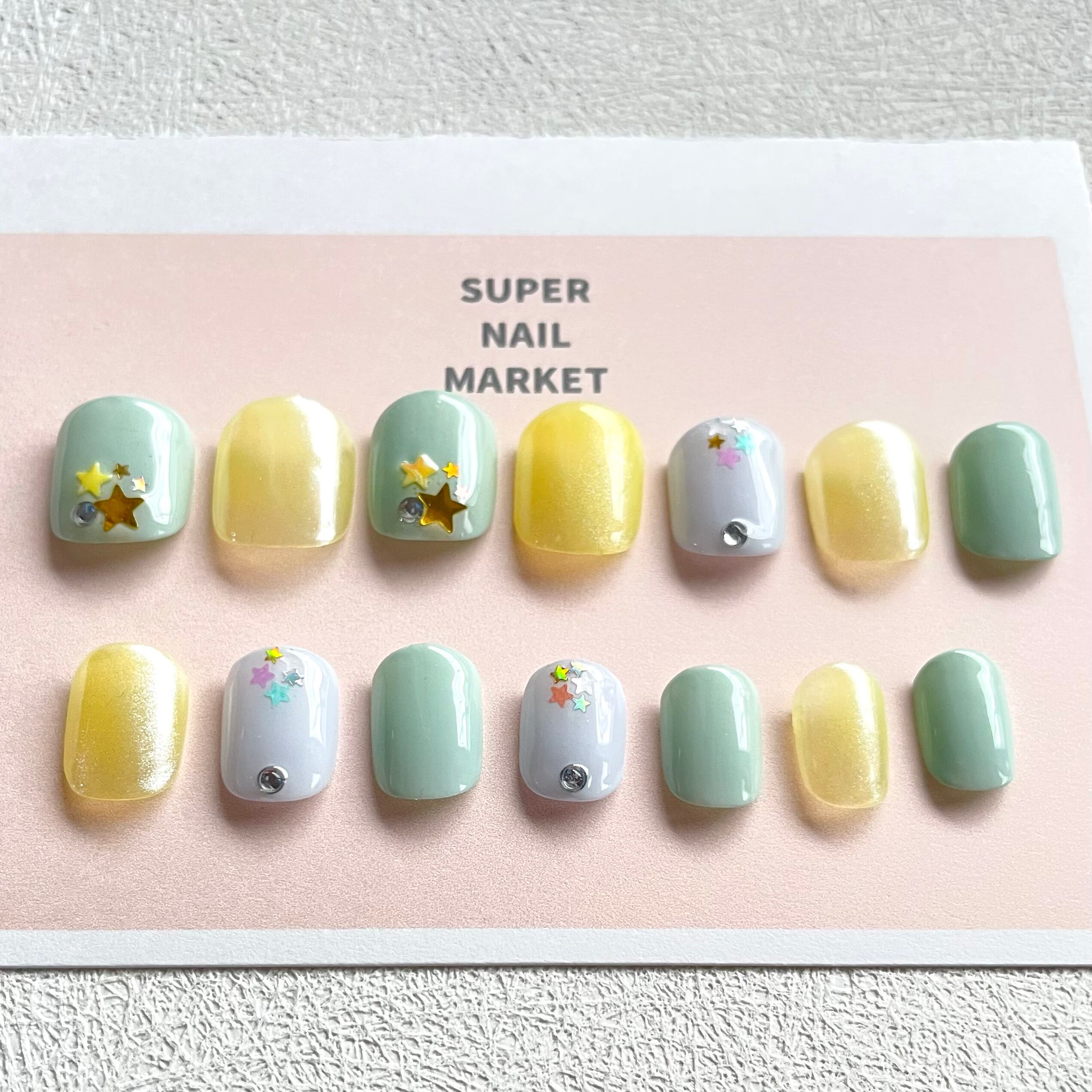 ミントやレモンカラーをベースに、星のホログラムを散りばめた、明るく楽しいデザインです。